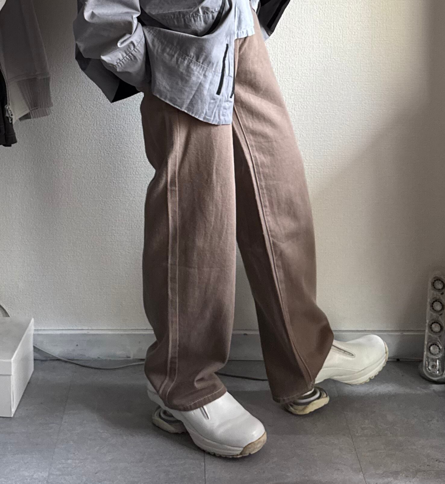 淡いブラウンカラーのストレートパンツ。