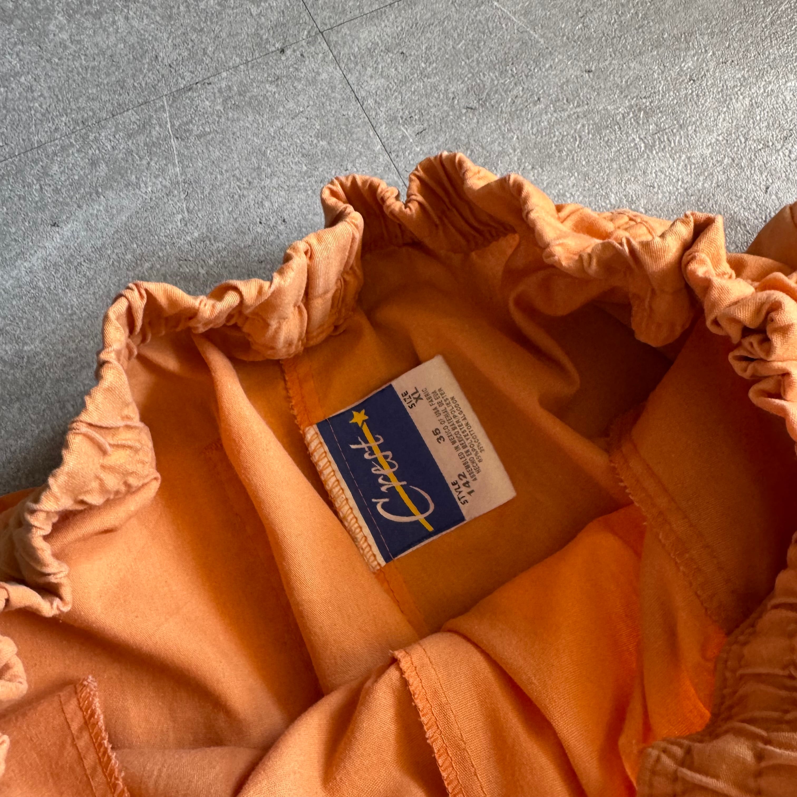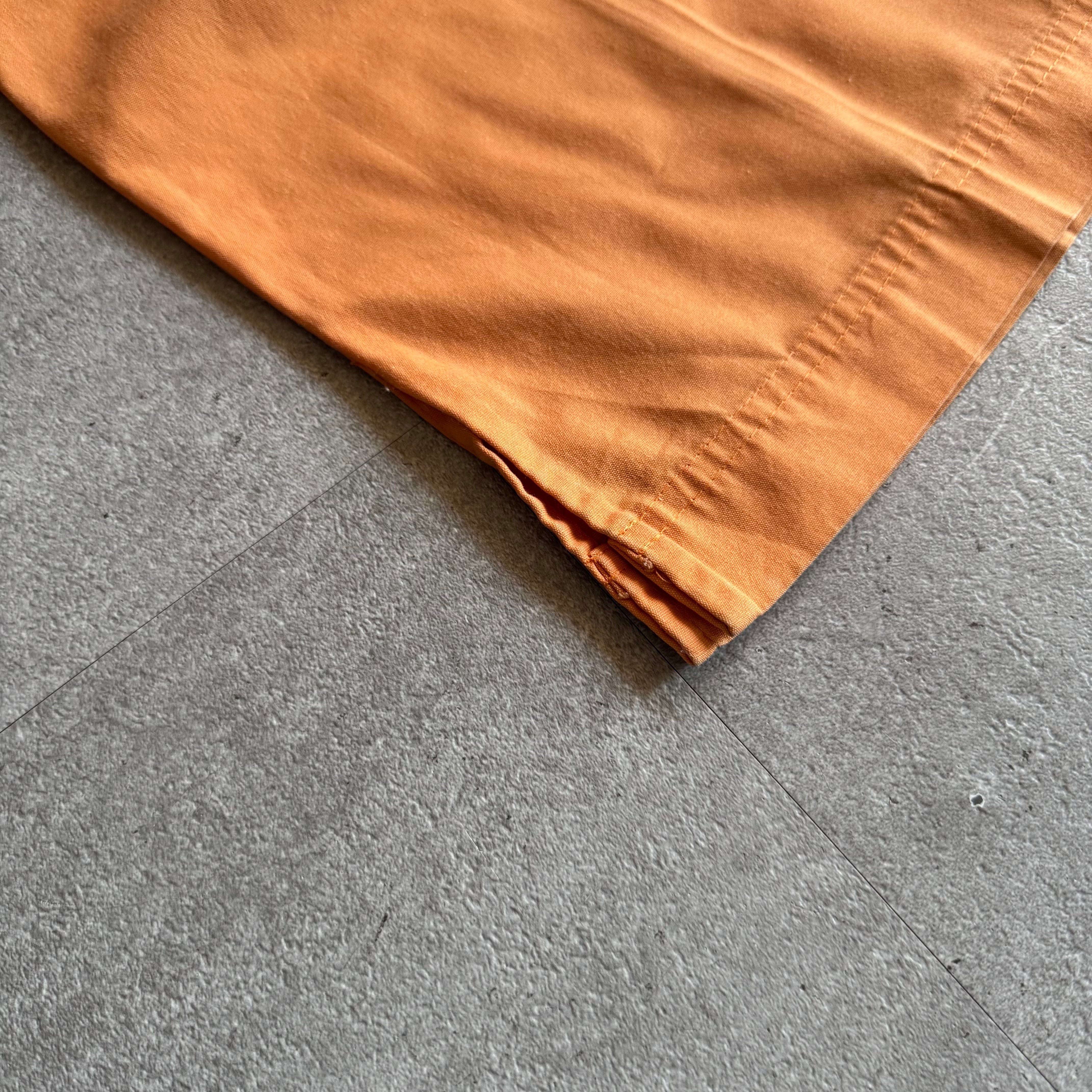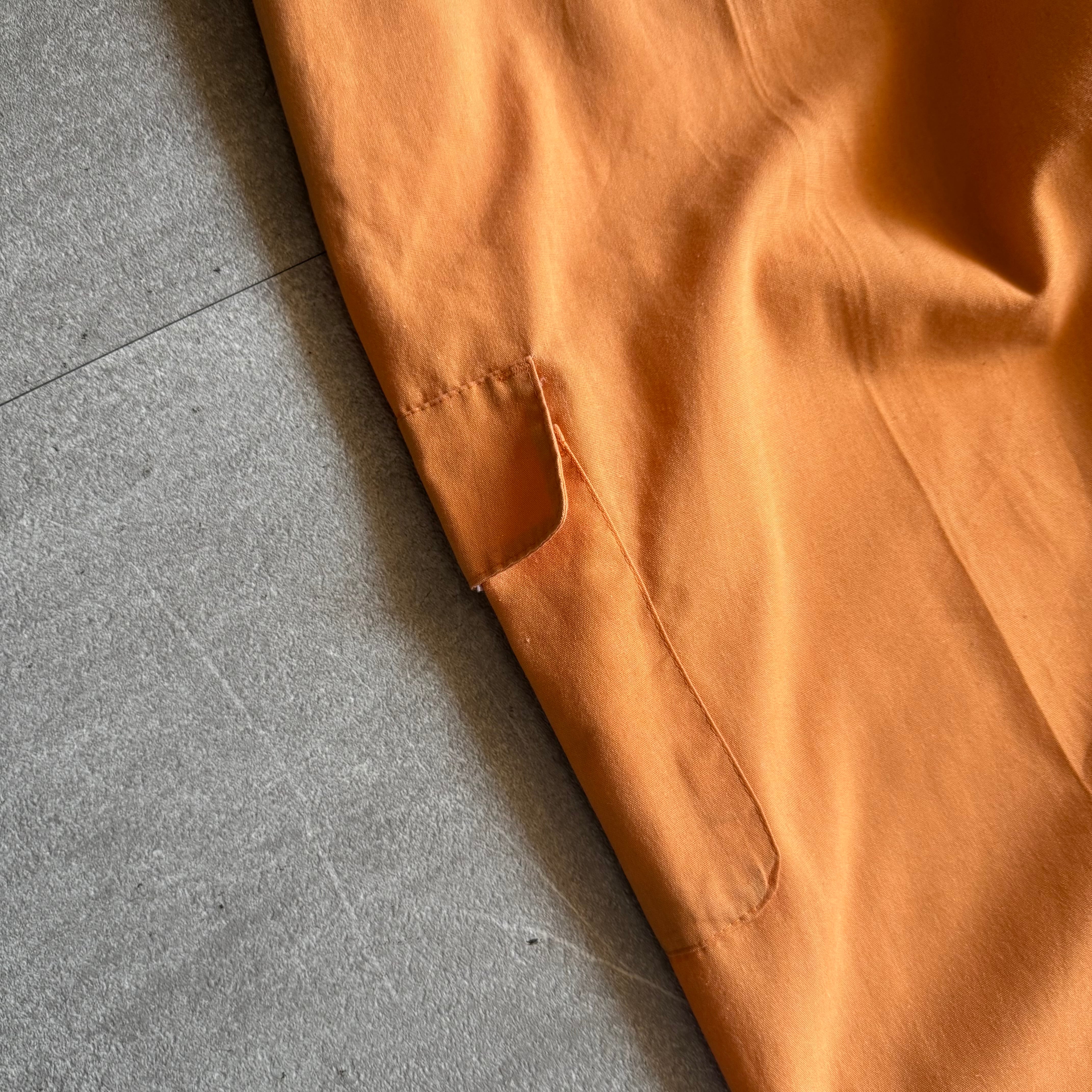 柔らかくも発色のいいオレンジカラーで、サイドのポケットに加え、裾には少しスリットが入っていて裾のたまり方もいい。