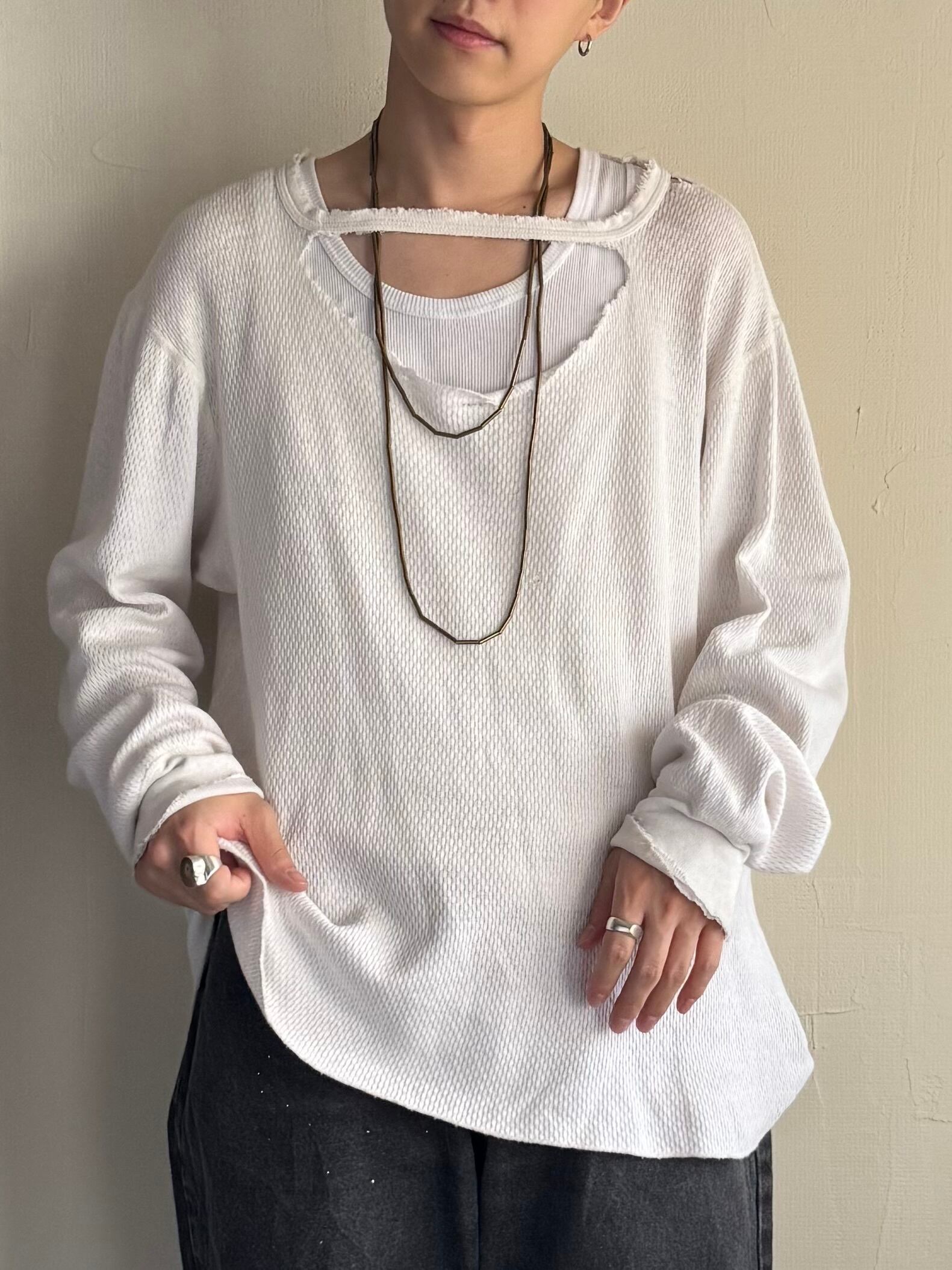 首元がリブに沿って破れネックレスなど見せて着るのにいいかも。