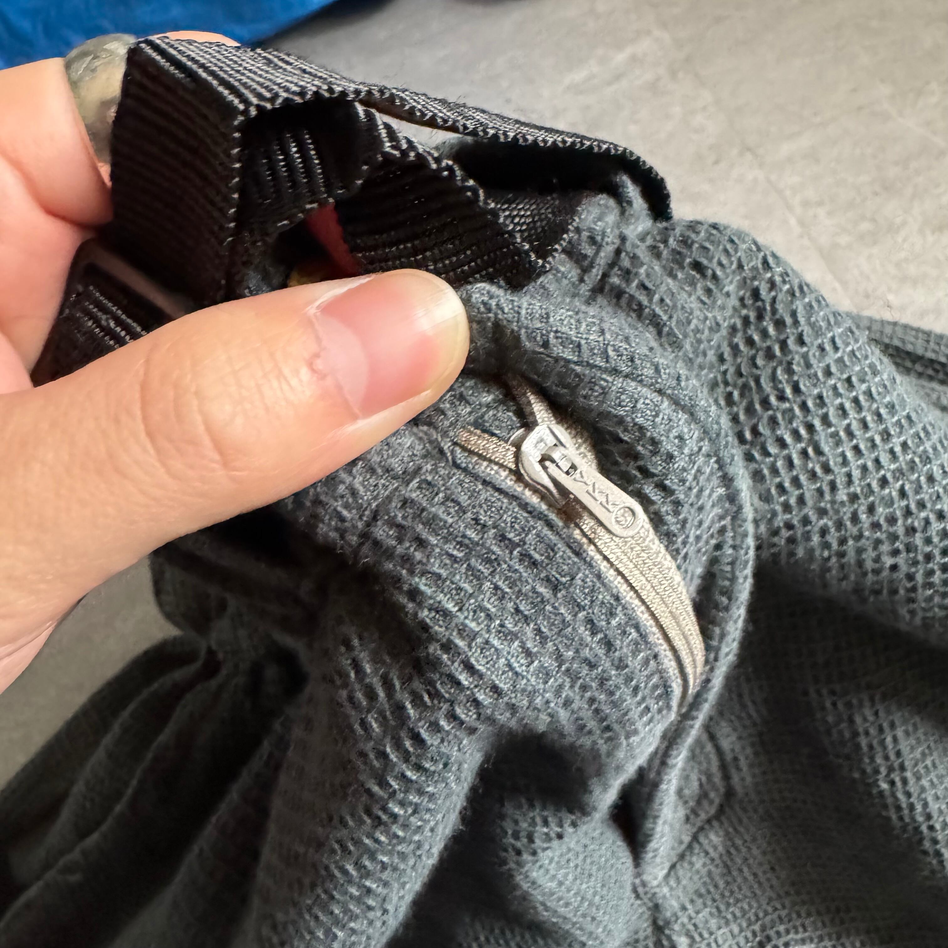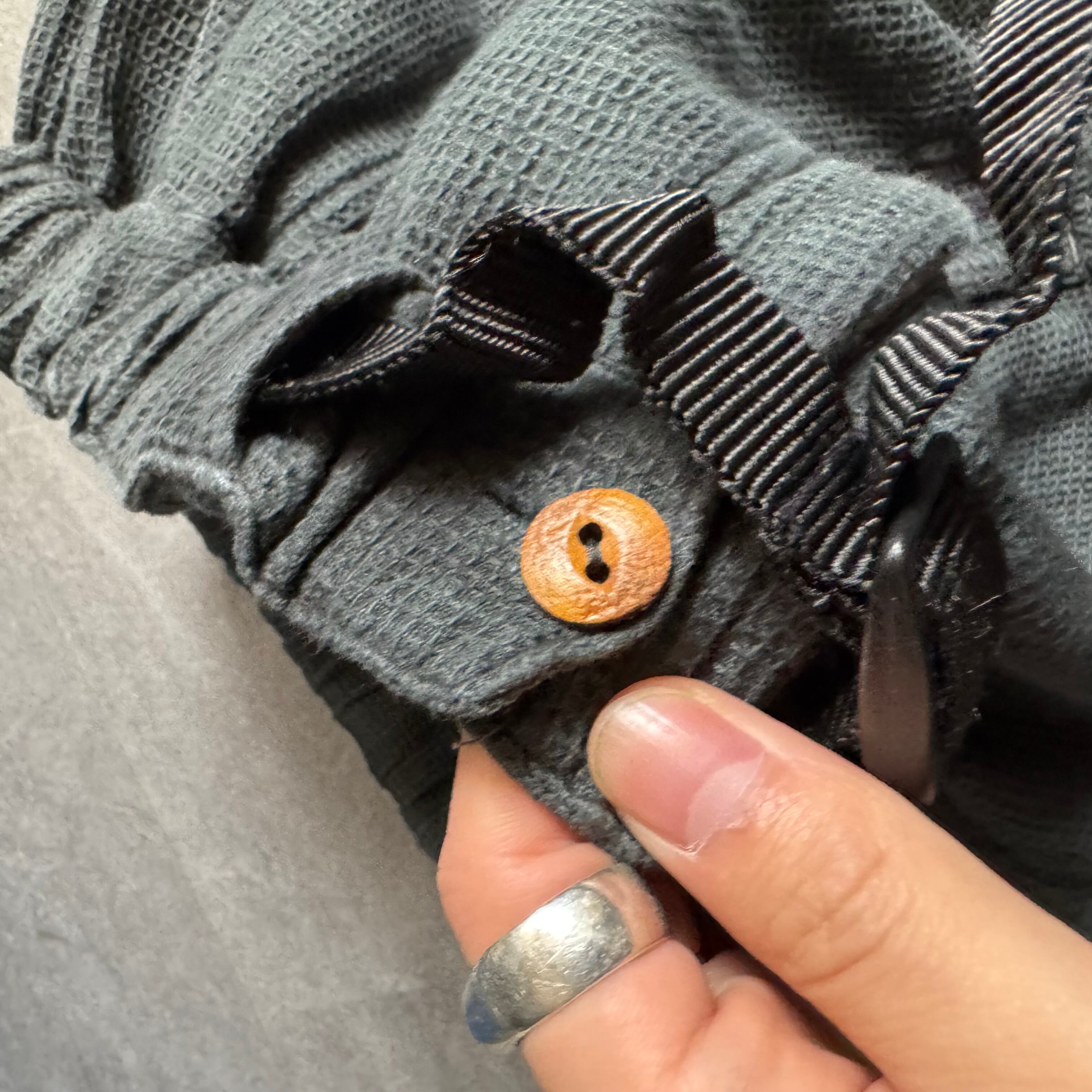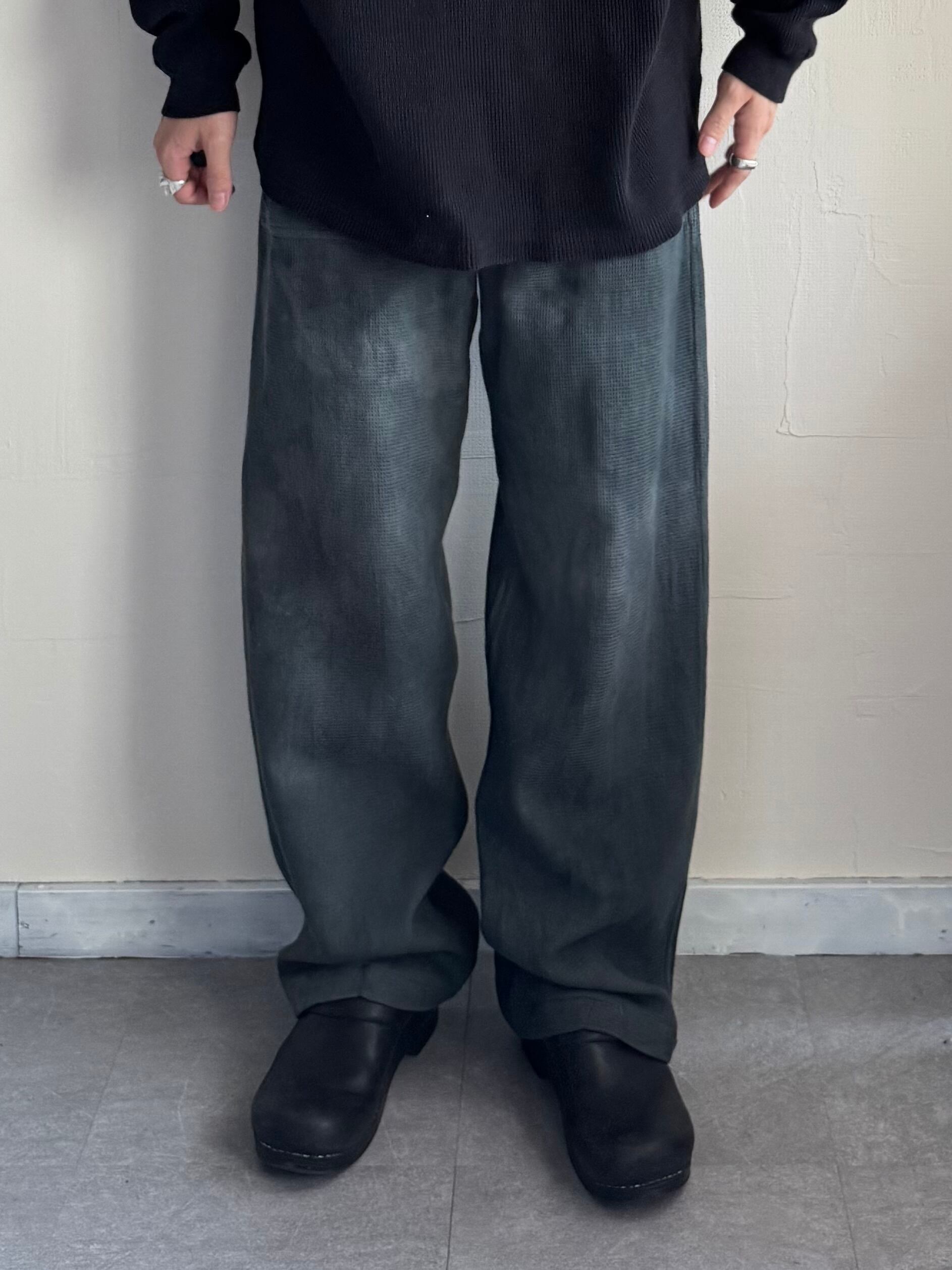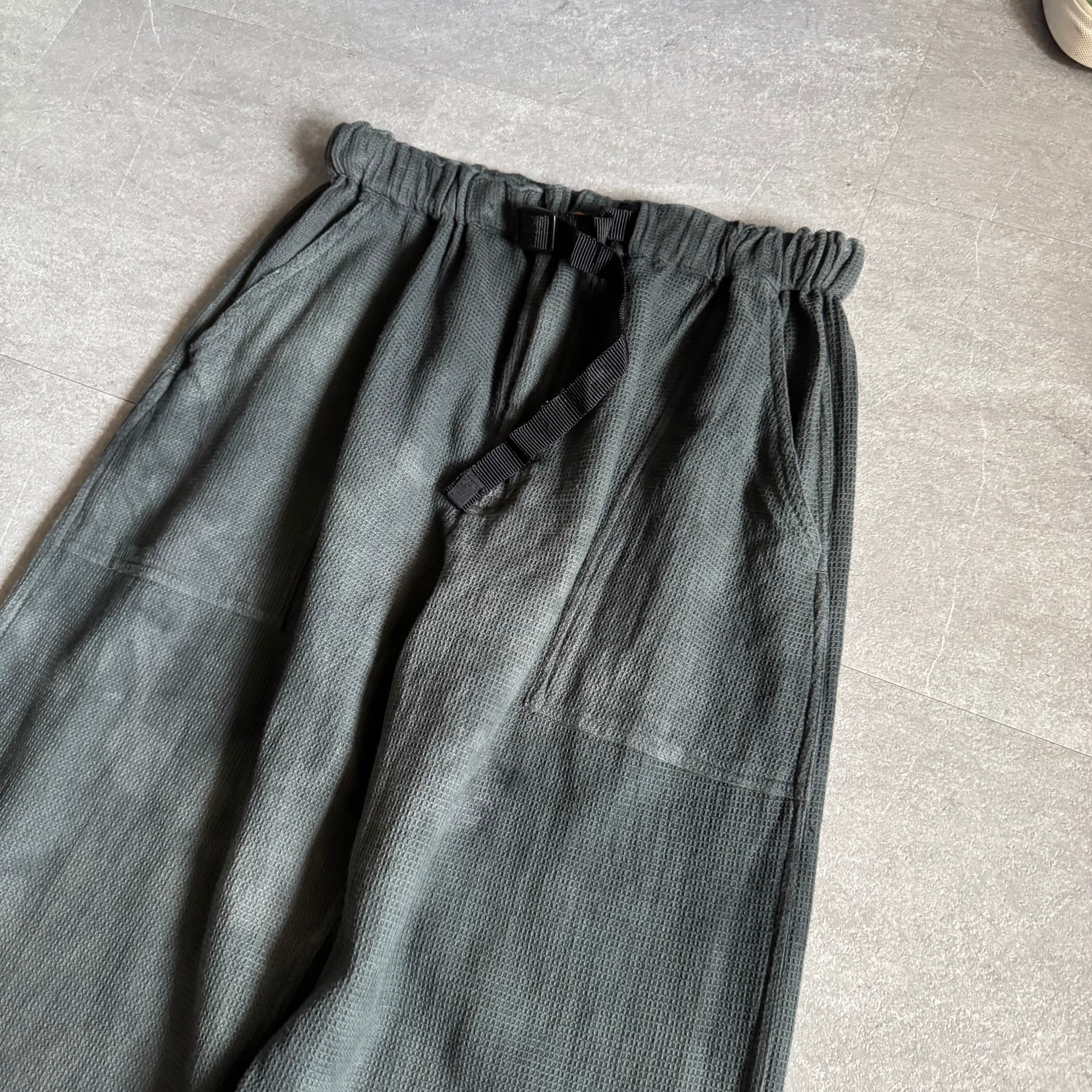 ムラのある後染めされたグレーブラック。ウエストはゴムとベルトアジャスターが着いてます。