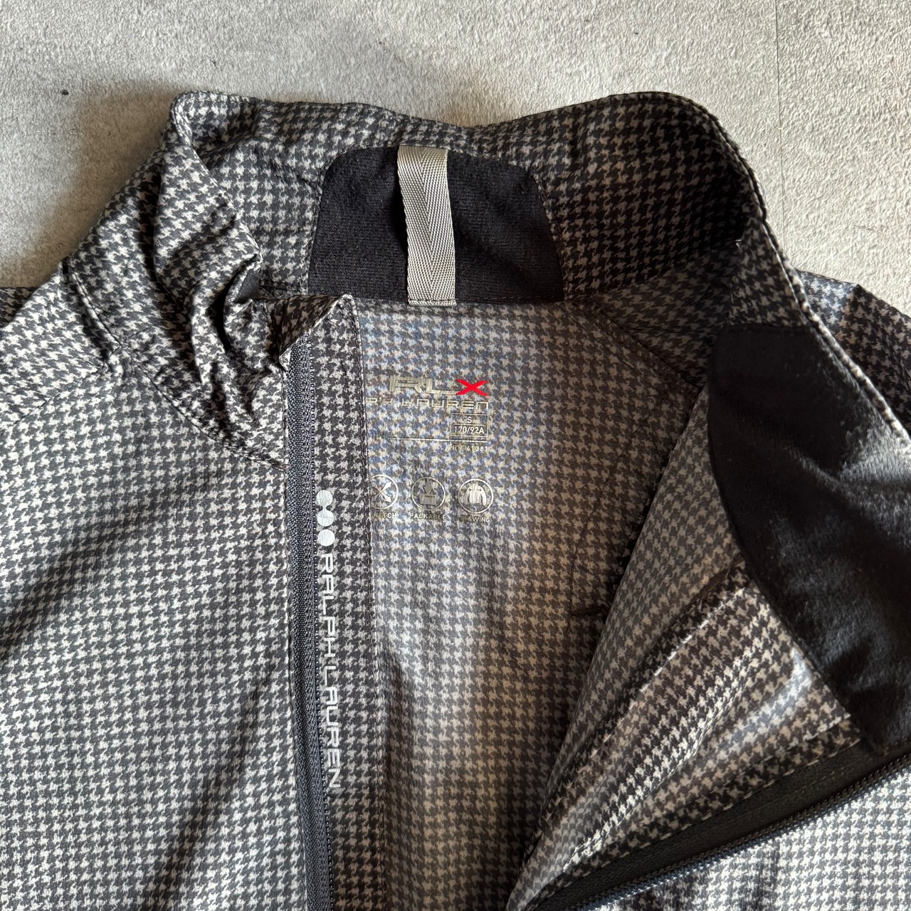 千鳥格子柄のナイロンシェルにフロントのハーフジップは少しずらした配置。