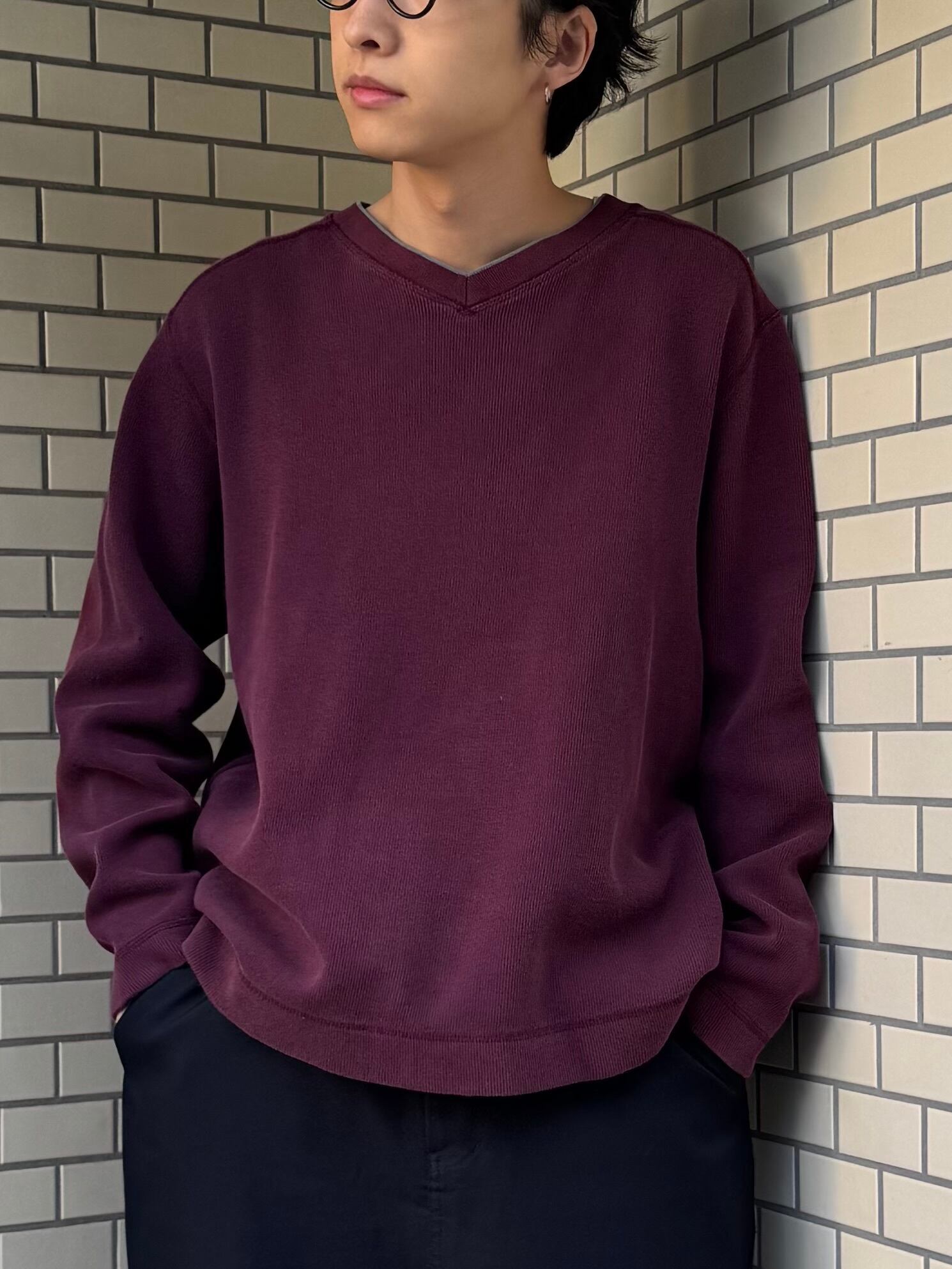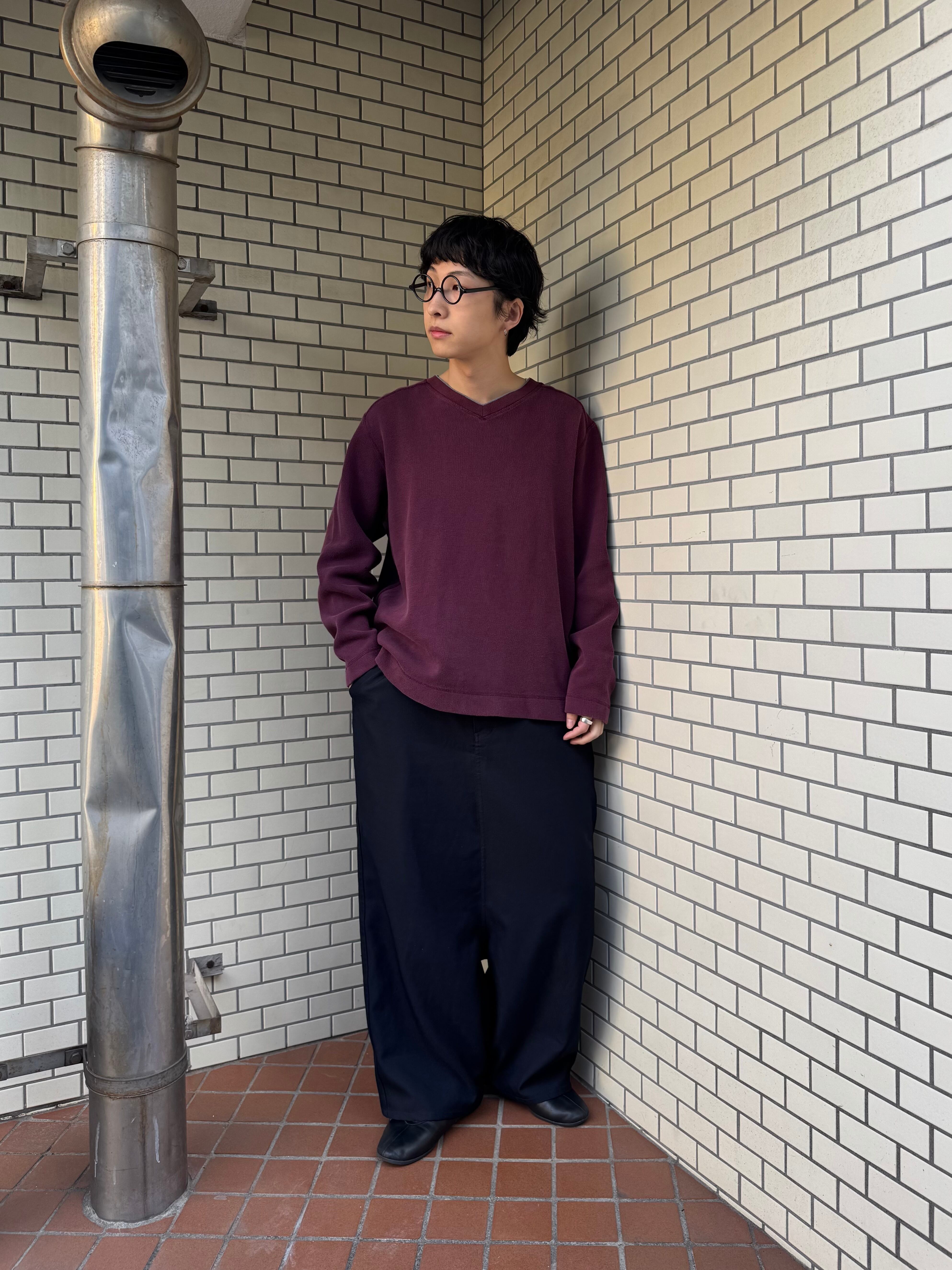 程よく薄手で首元のVネックが程よい抜け感。