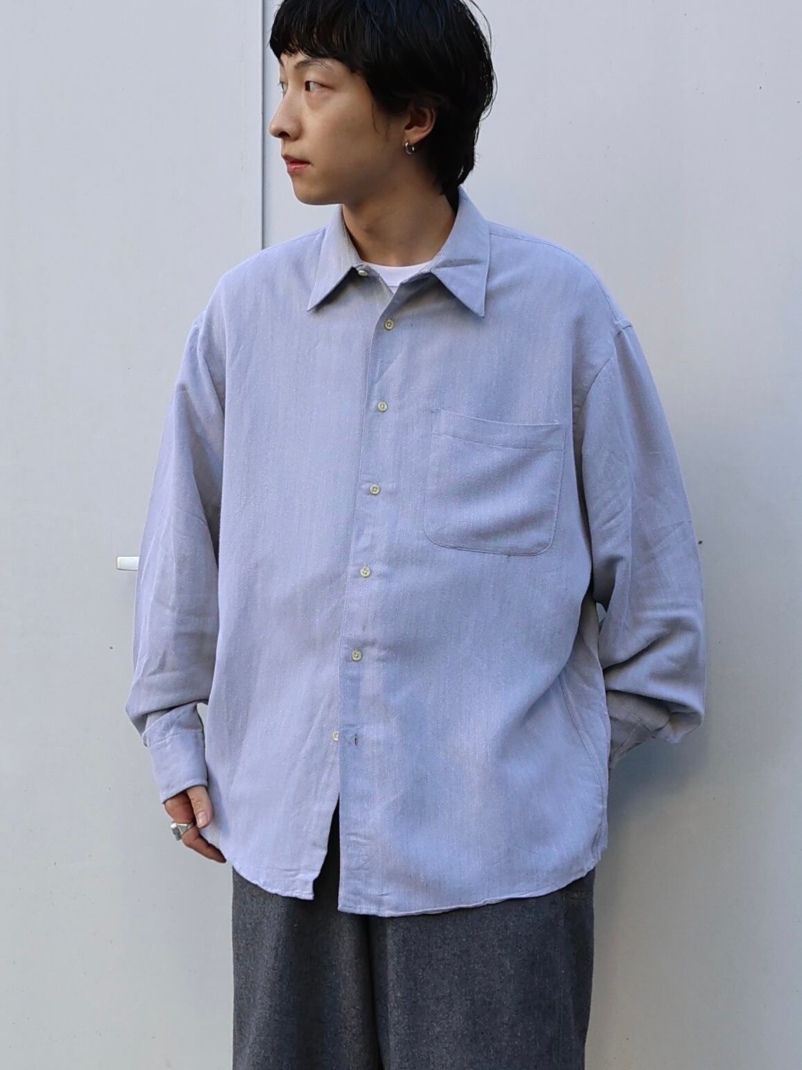 rayon60%にポリエステルの混ざるふわっとした質感にとろみの合わさったシャツ。