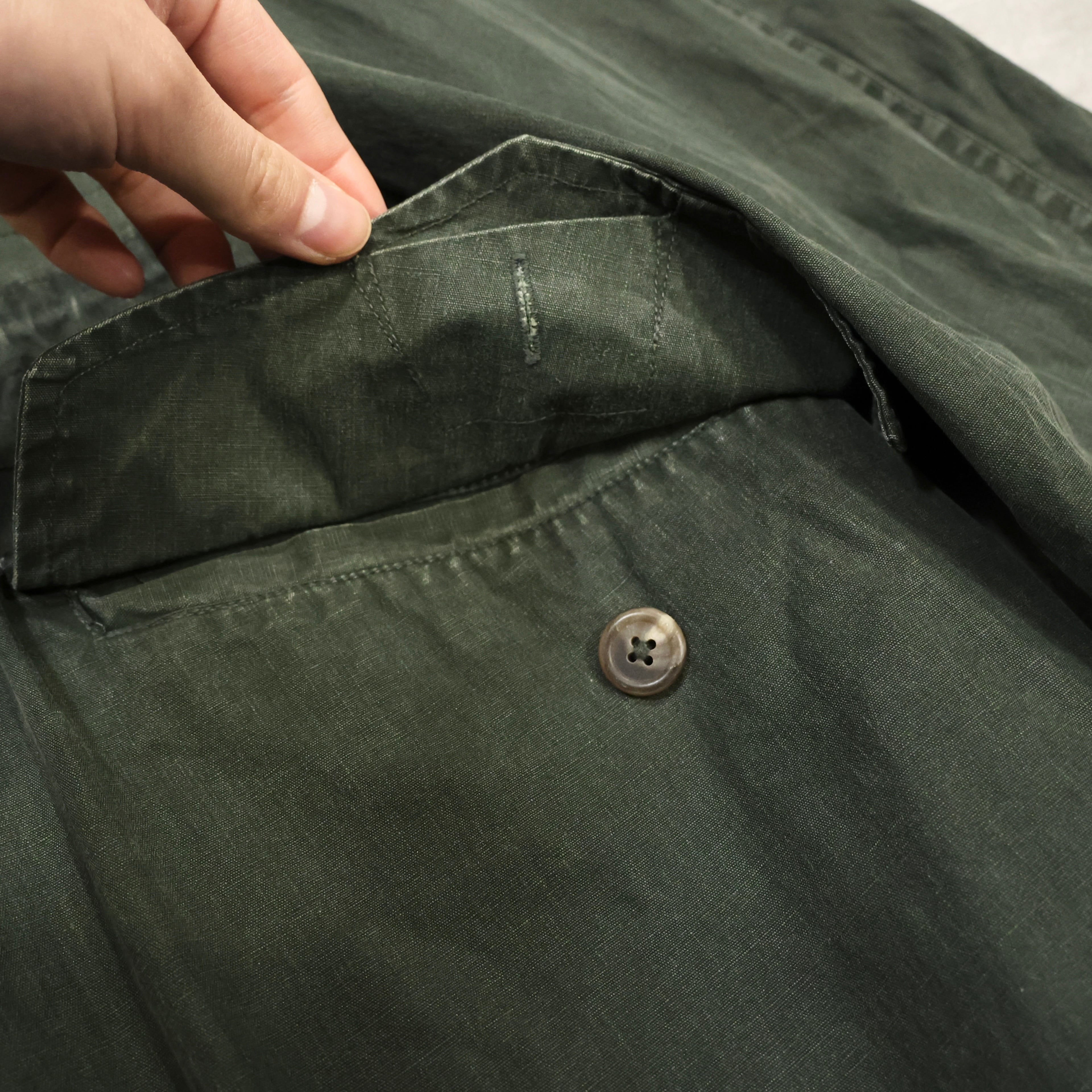 胸ポケは片方のみで縦型に変更の胸ポケ横のステッチが実はアロー型になってるんです。