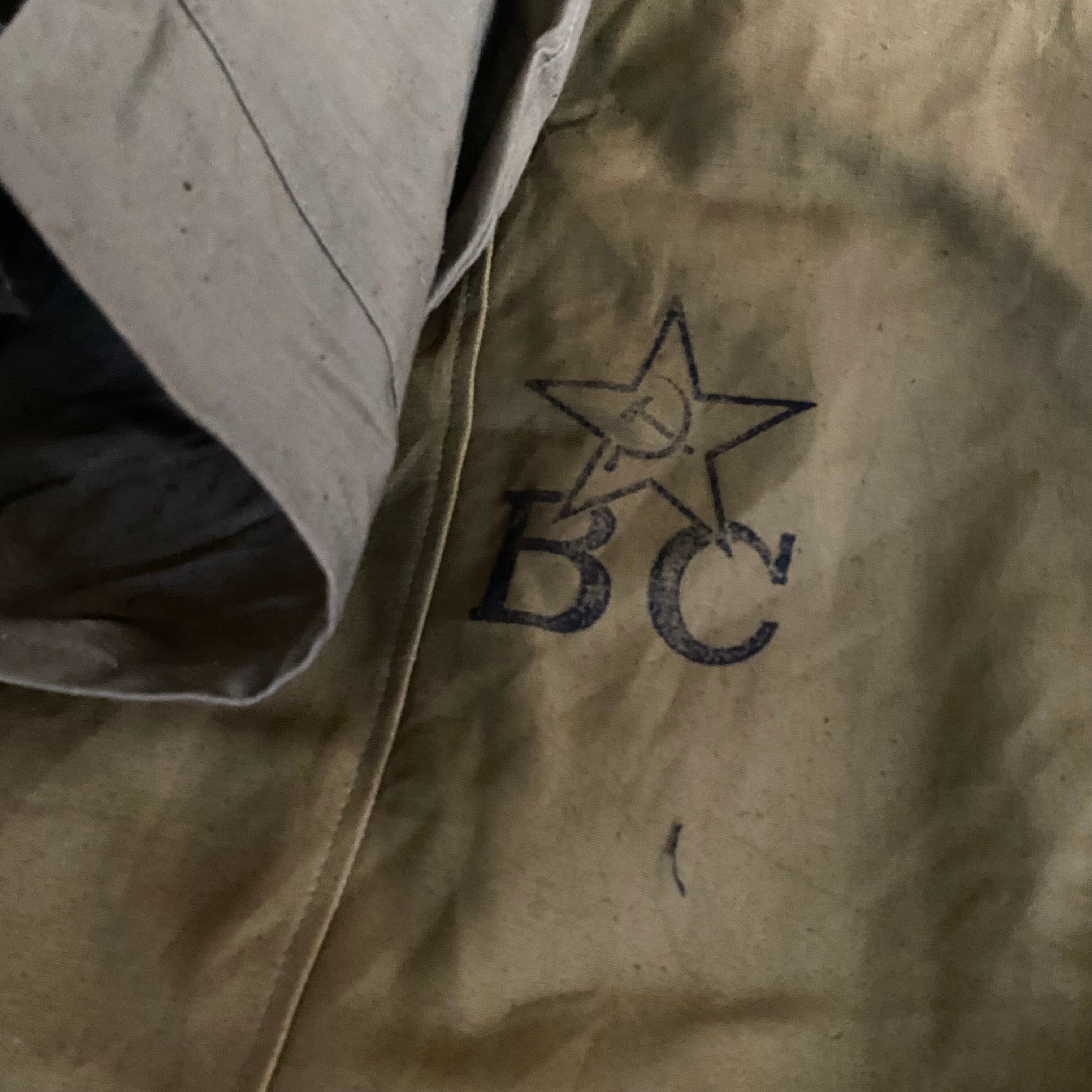 バックには「鎌と槌」をモチーフにしたソビエト軍のスターシンボルと、BCの文字がステンシルで施されています。