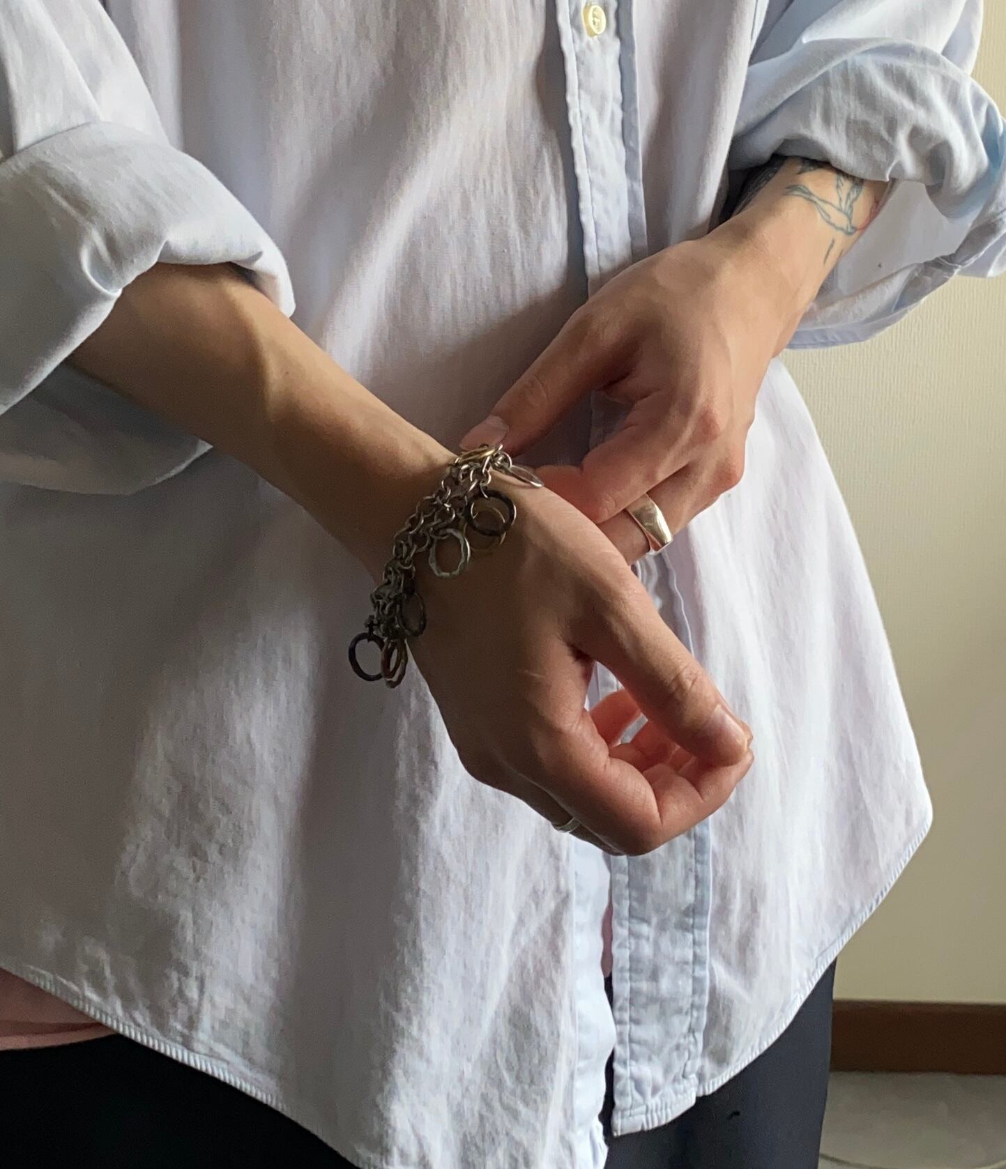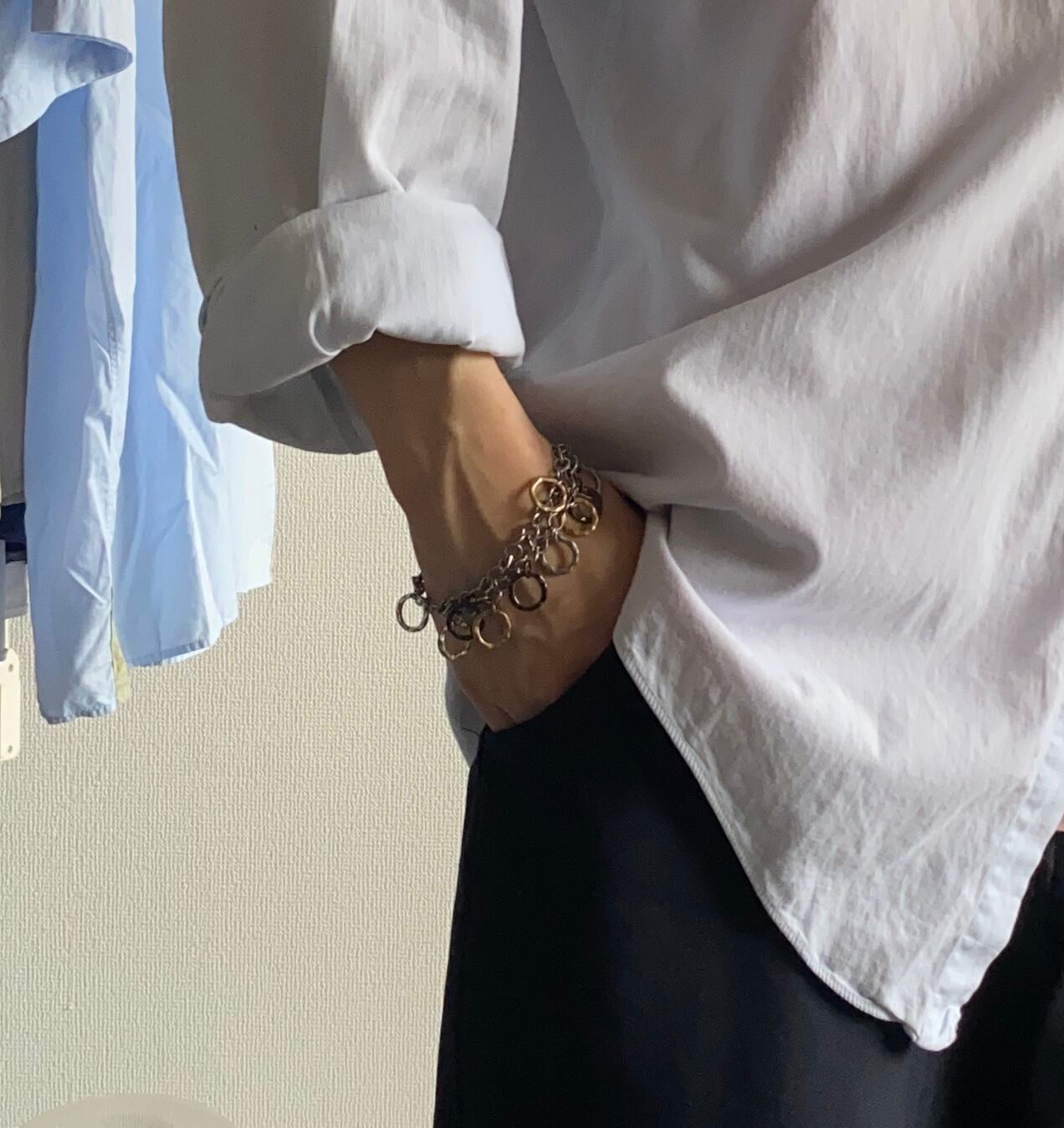 元々のチェーンのデザインが面白くて、ゴールド、シルバーブラックのフープを取り付けたボリュームのある個体。