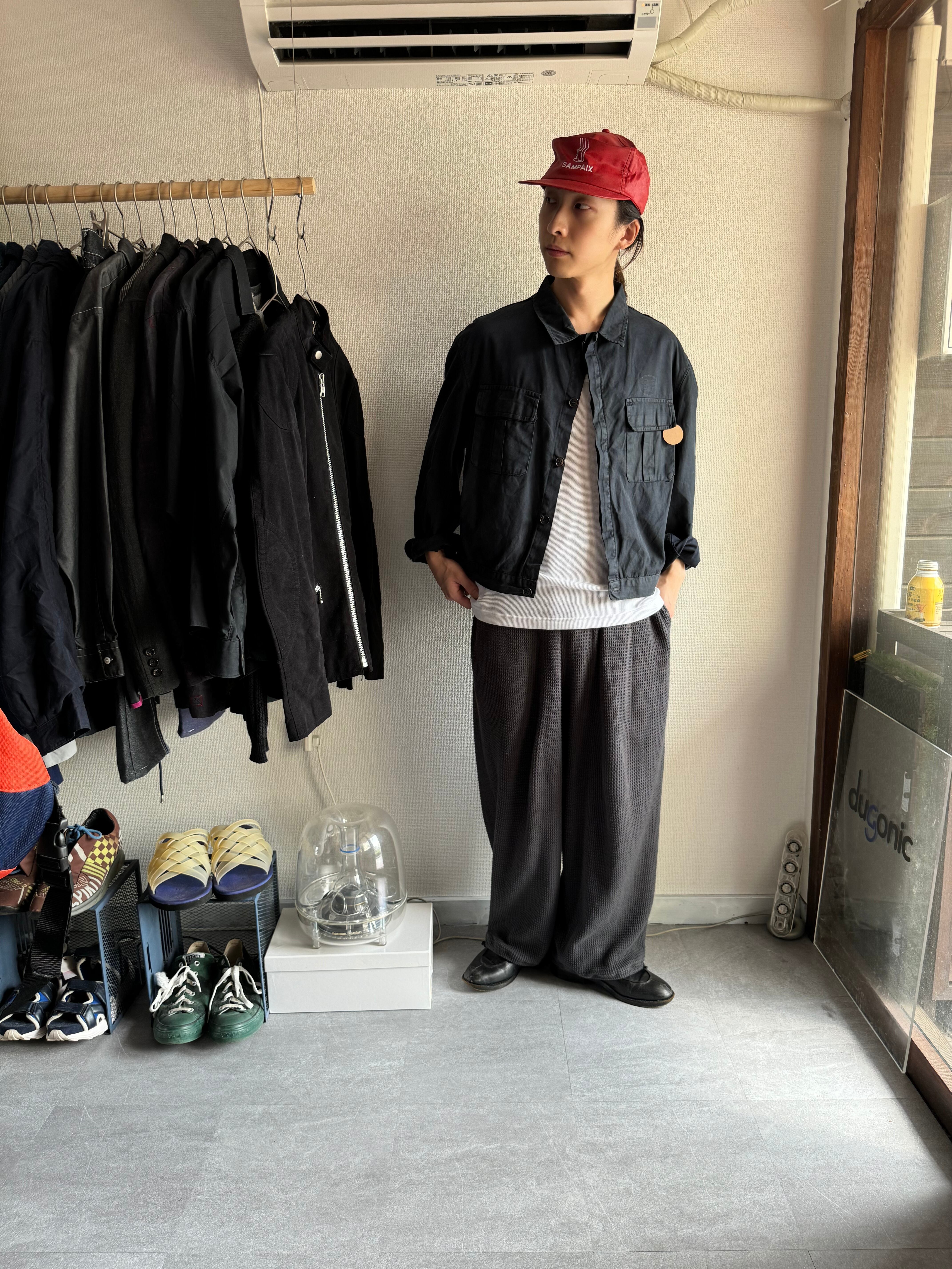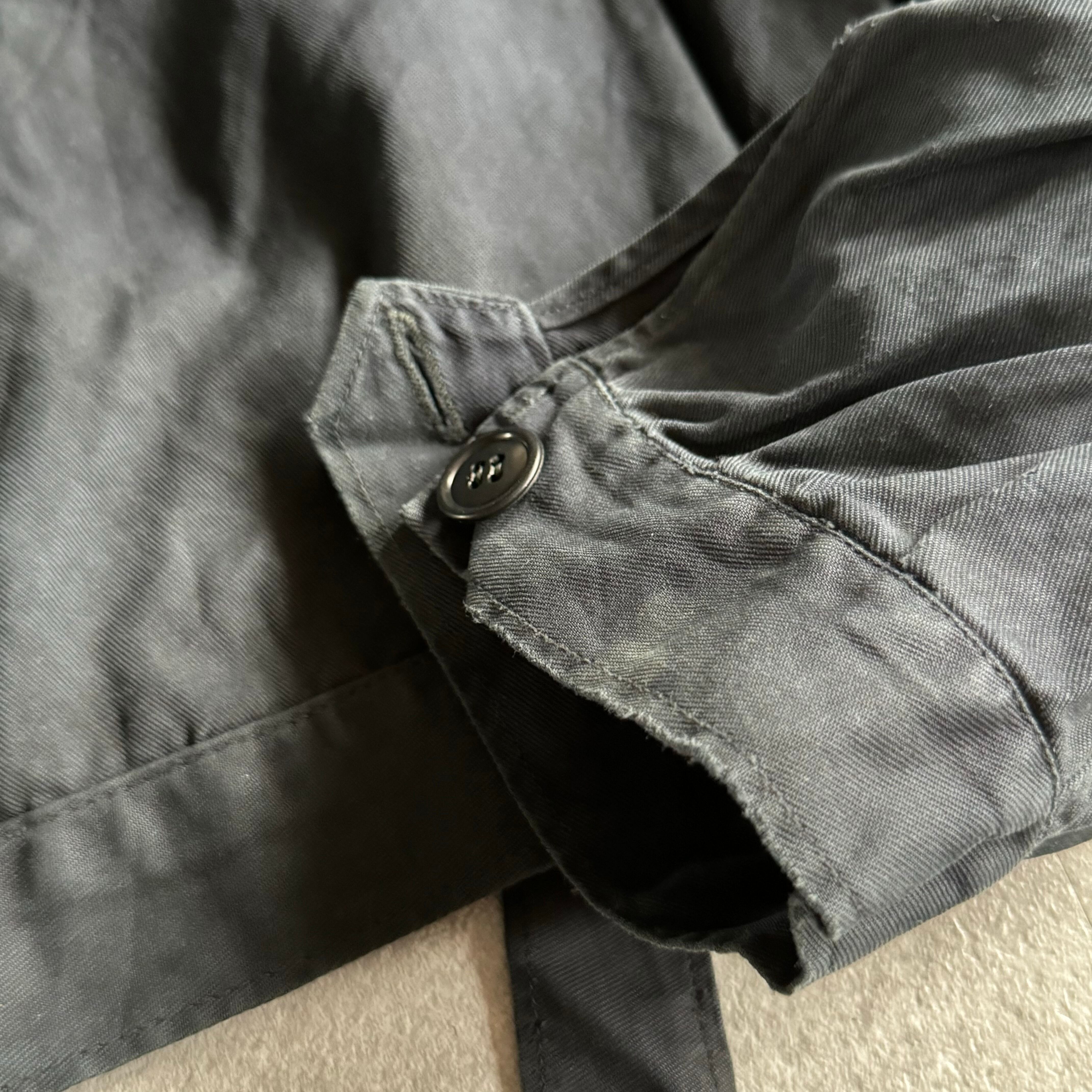 自転車などに乗る際に着用されていたもので裾には風をの侵入を防ぐアジャスターが着けられフロントのボタンも比翼になっています。