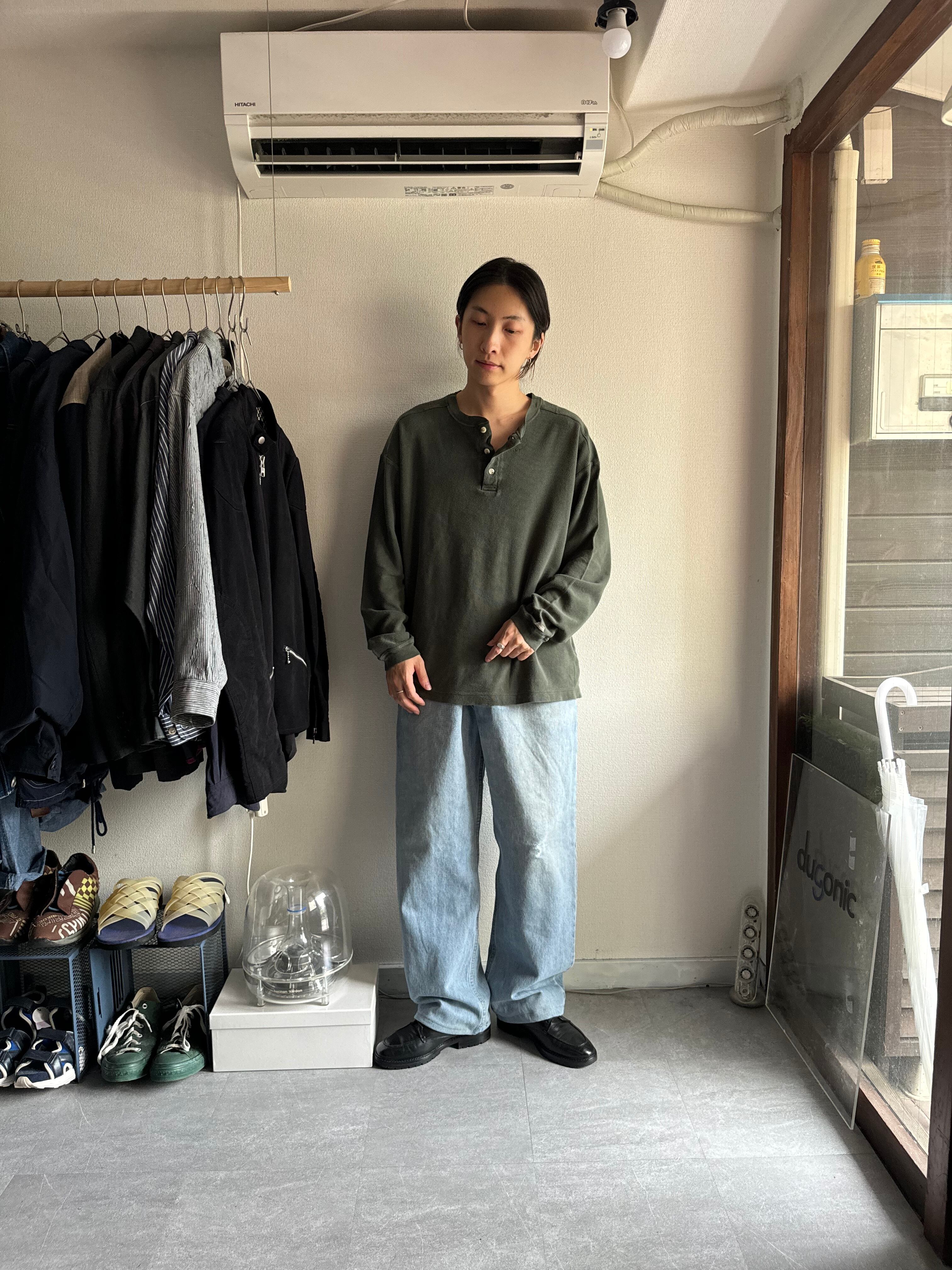 首元はヘンリーネックになっており着脱が楽なのはもちろん、ボタンを開けて抜け感も作れちゃう。