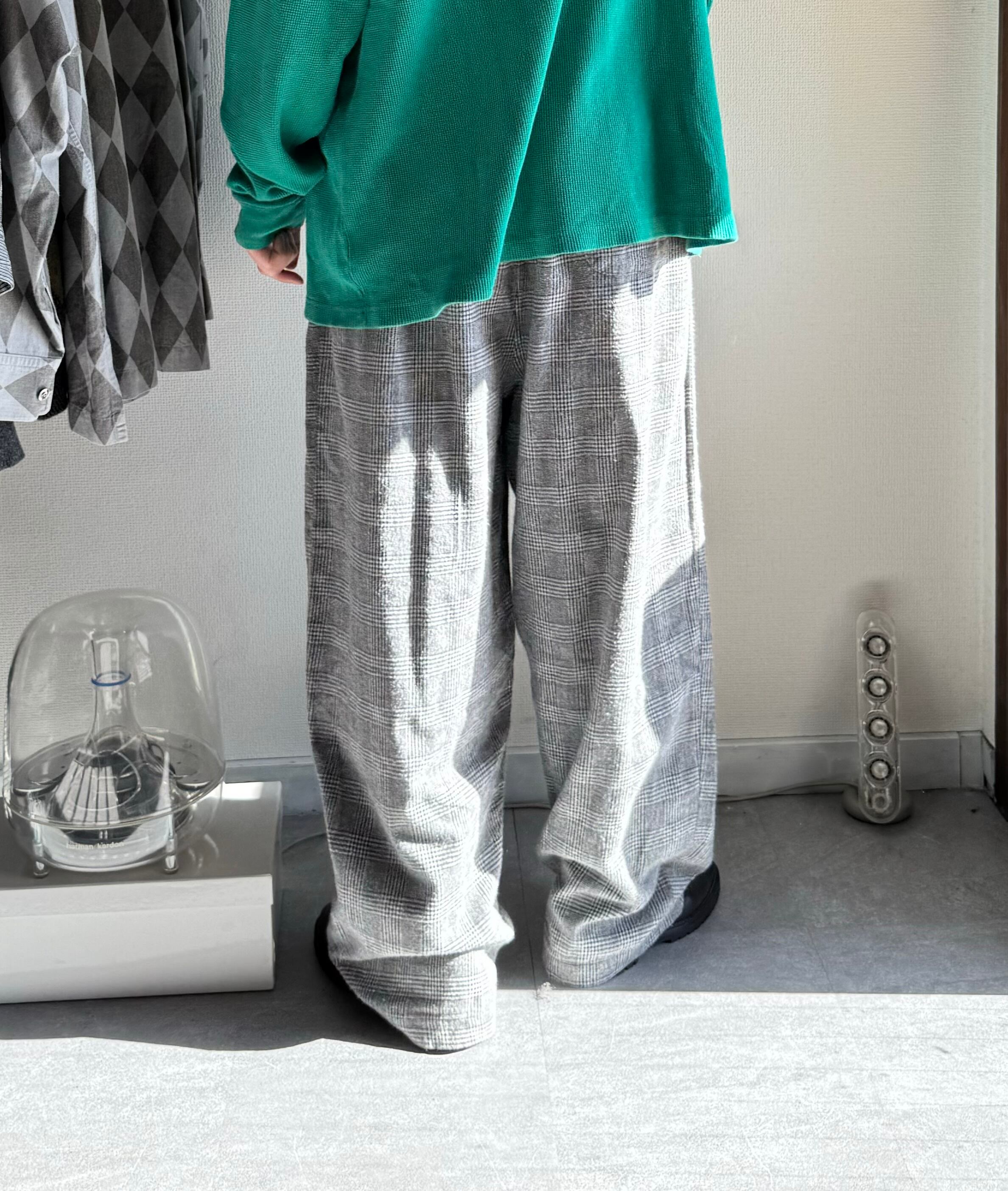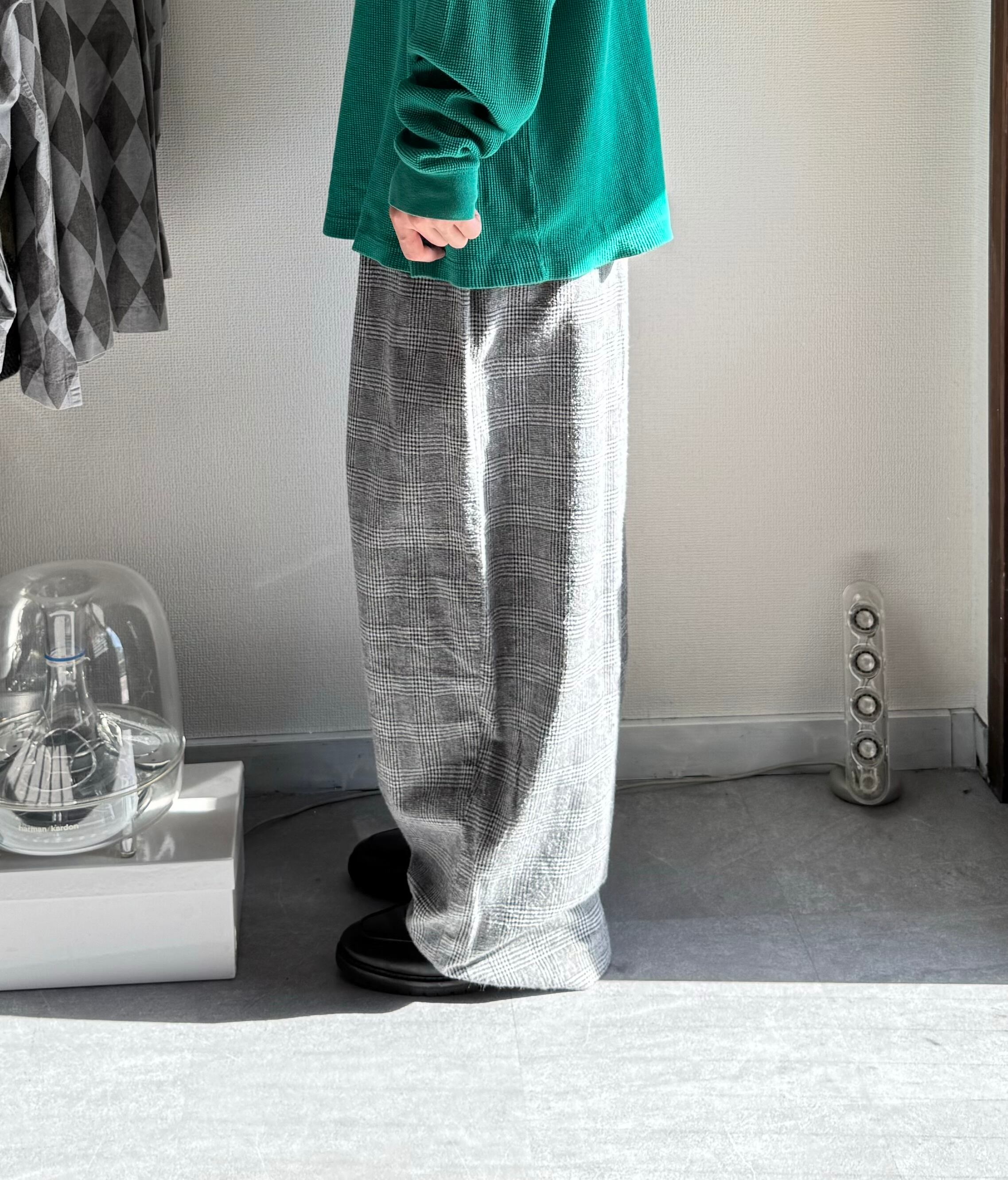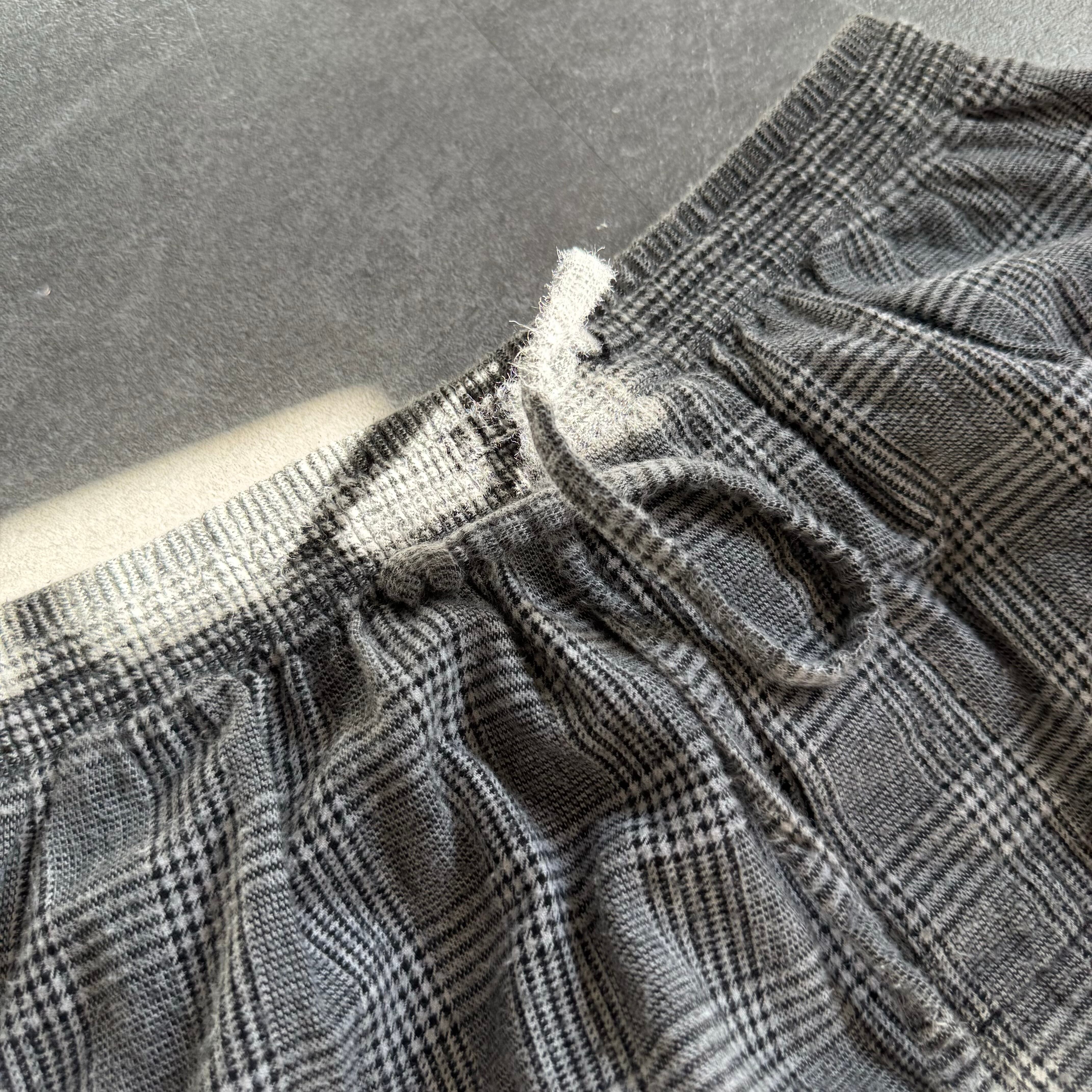 グレンチェックでコットンの少し毛羽立ったような風合いが柔らかい雰囲気のチェックに見える。