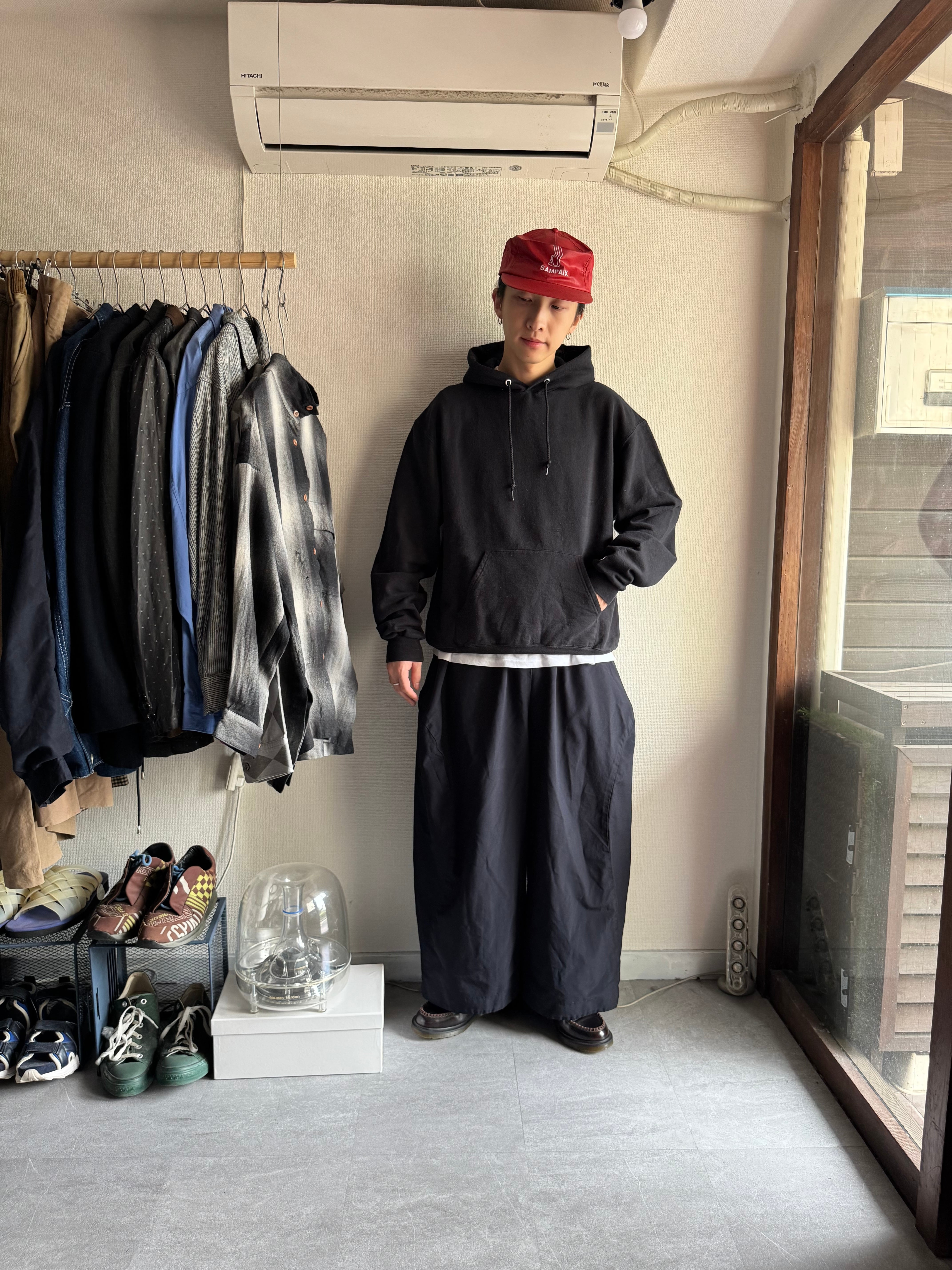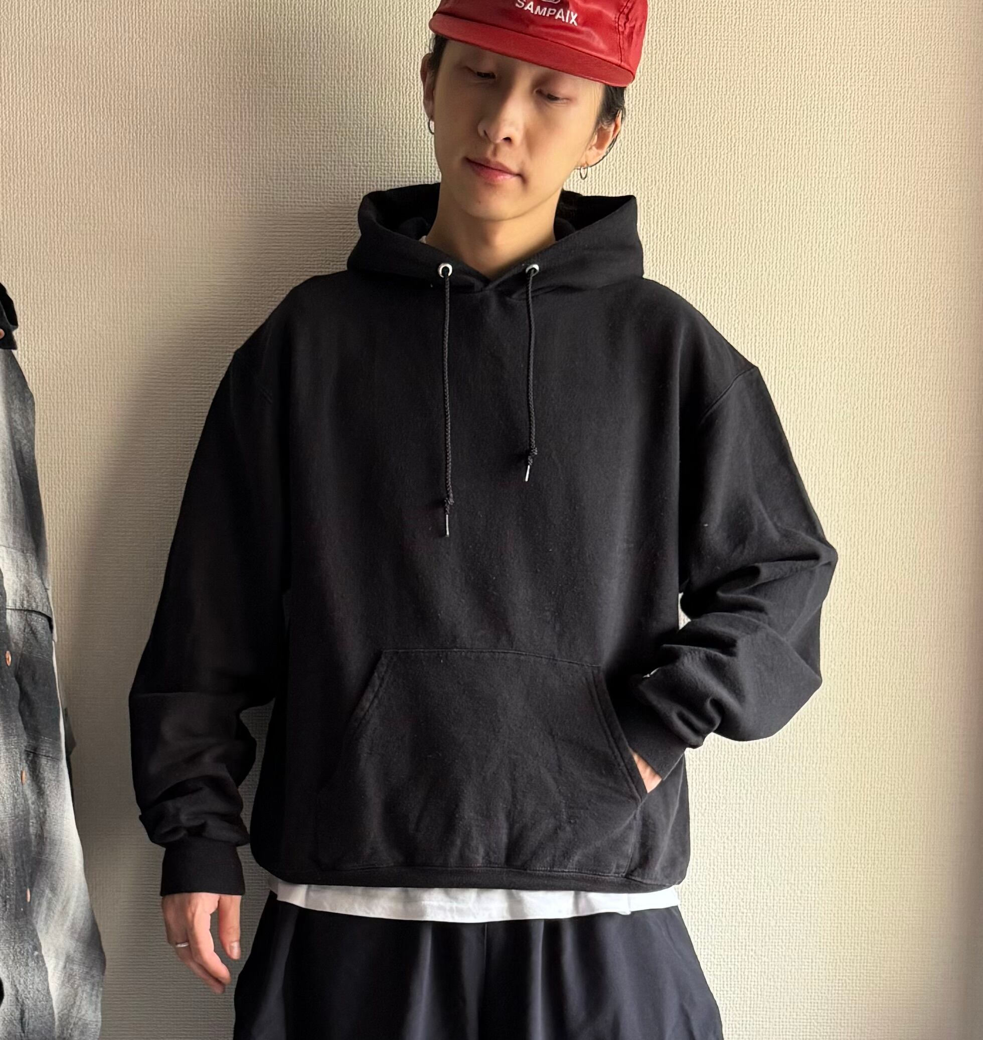 Championより何の変哲もないブラックのスウェットフーディ。