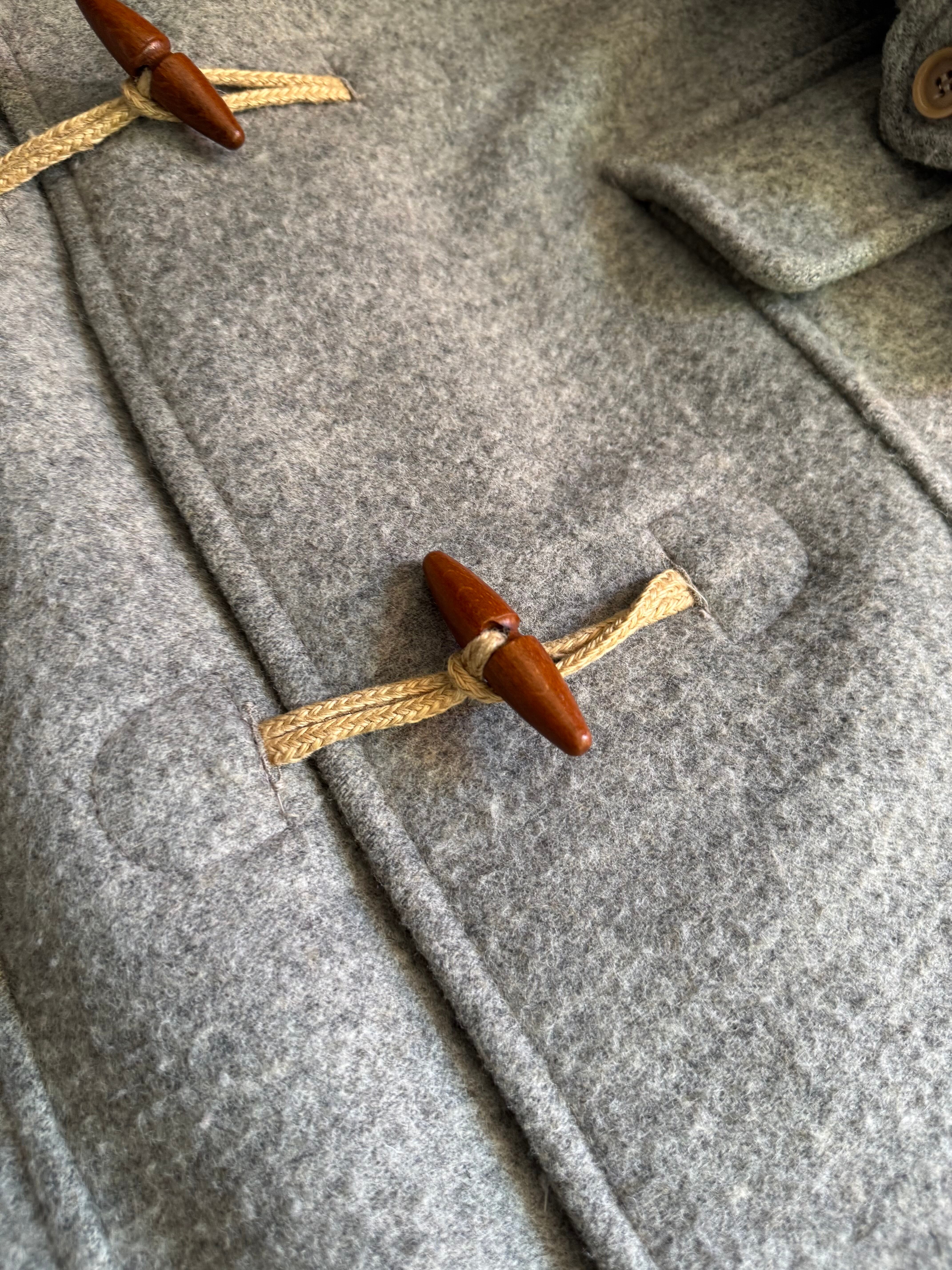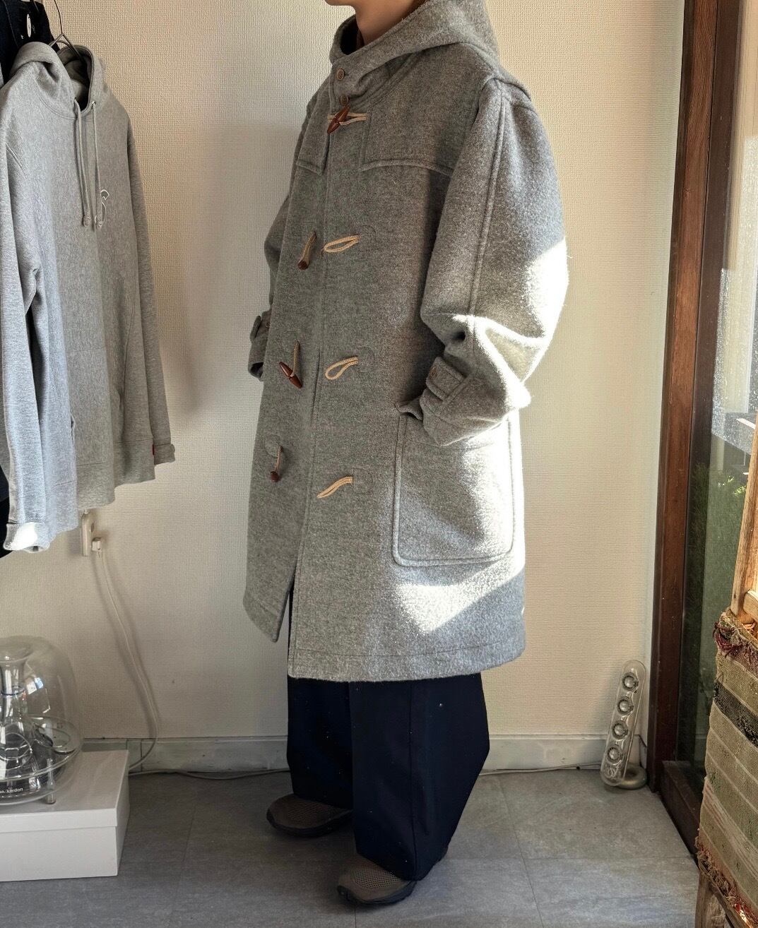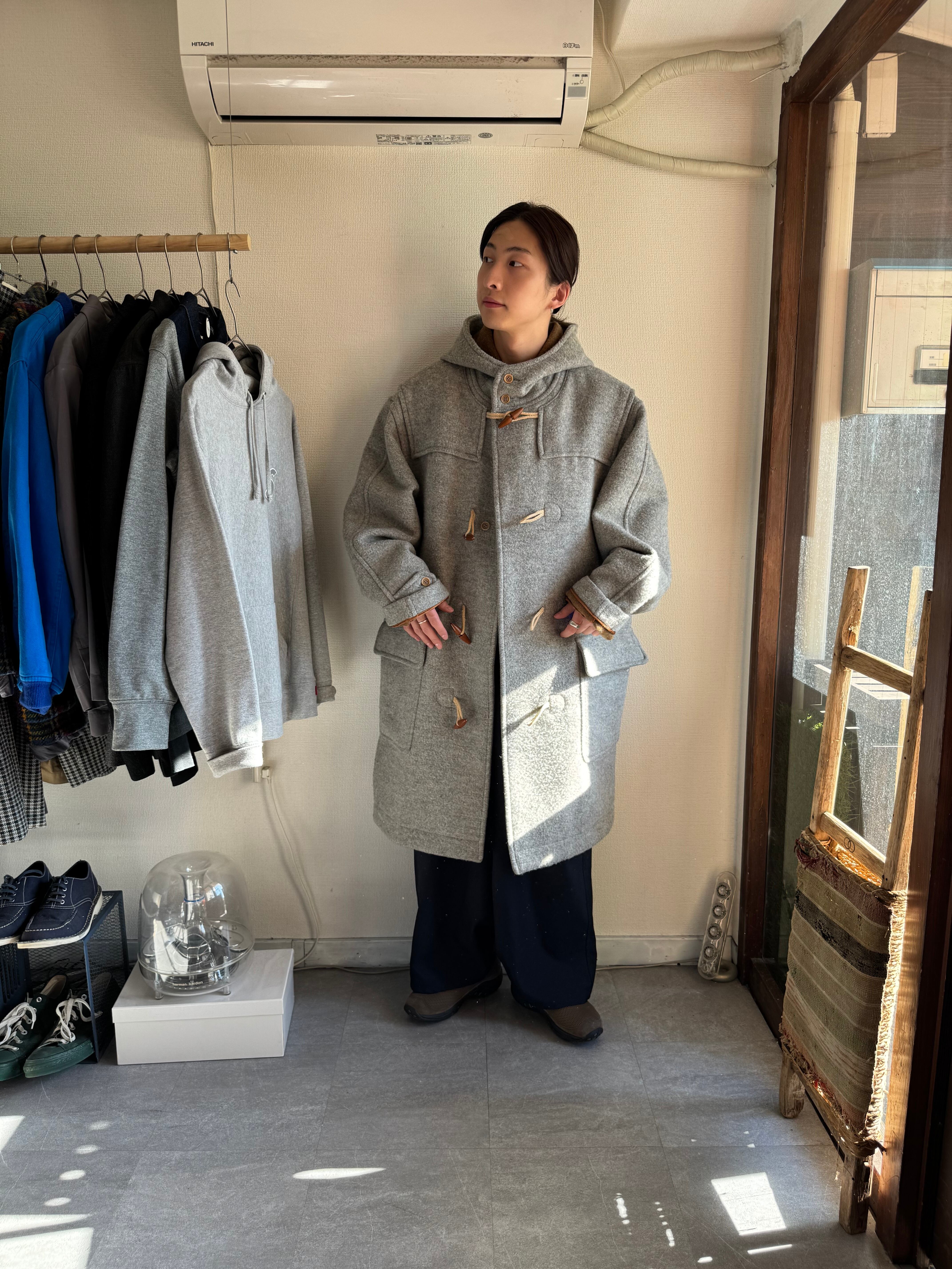 あまり見かけないグレーのダッフルコート。